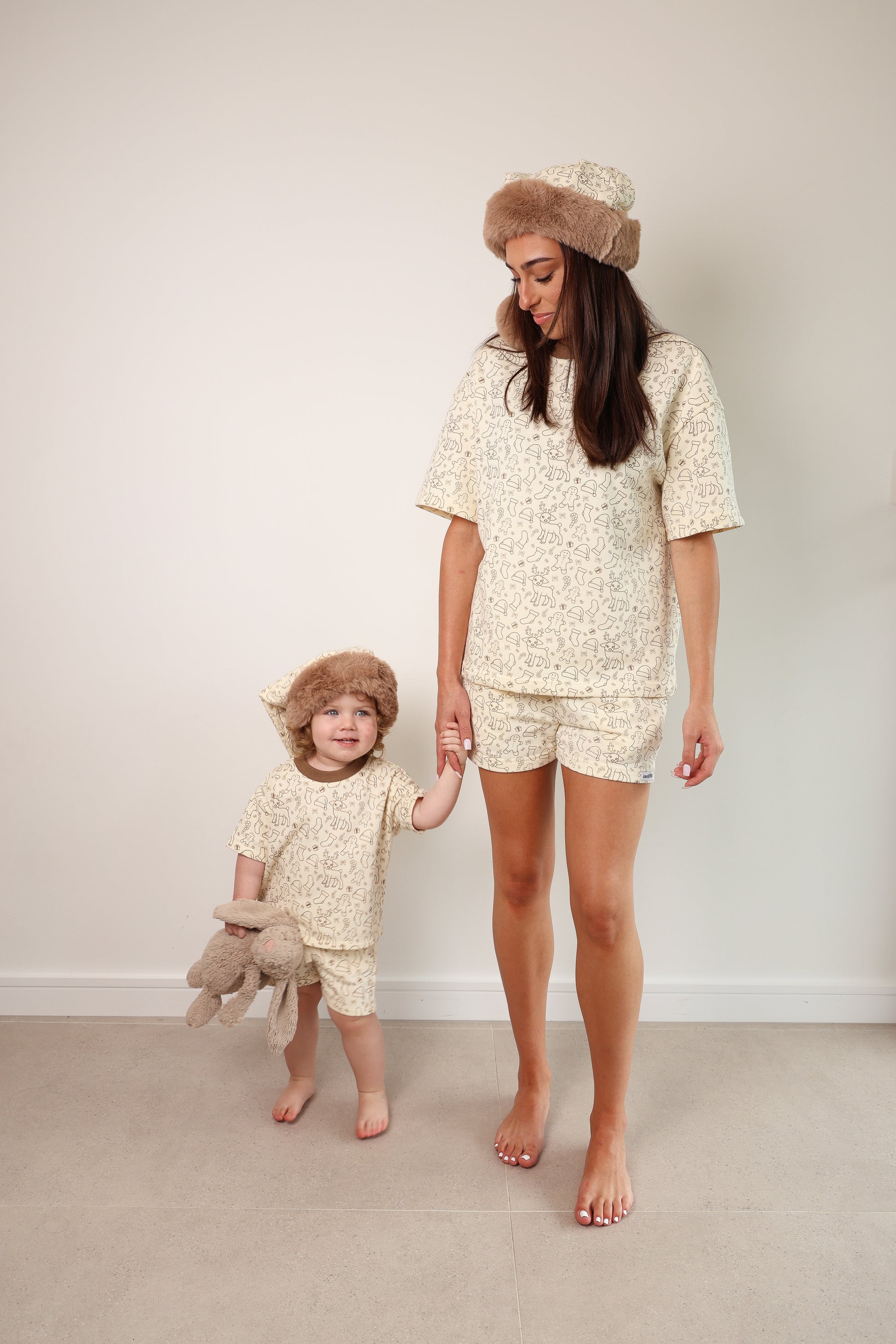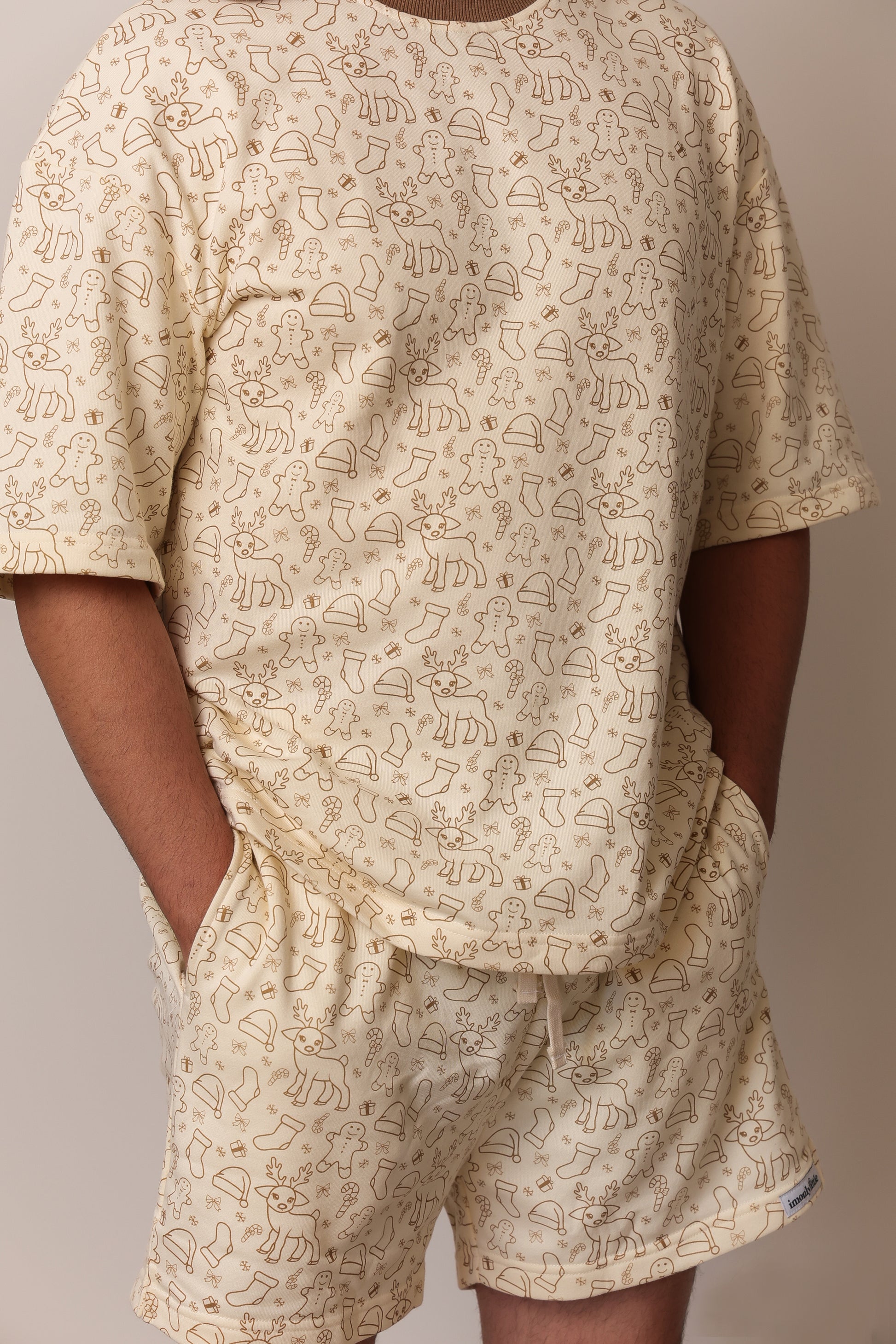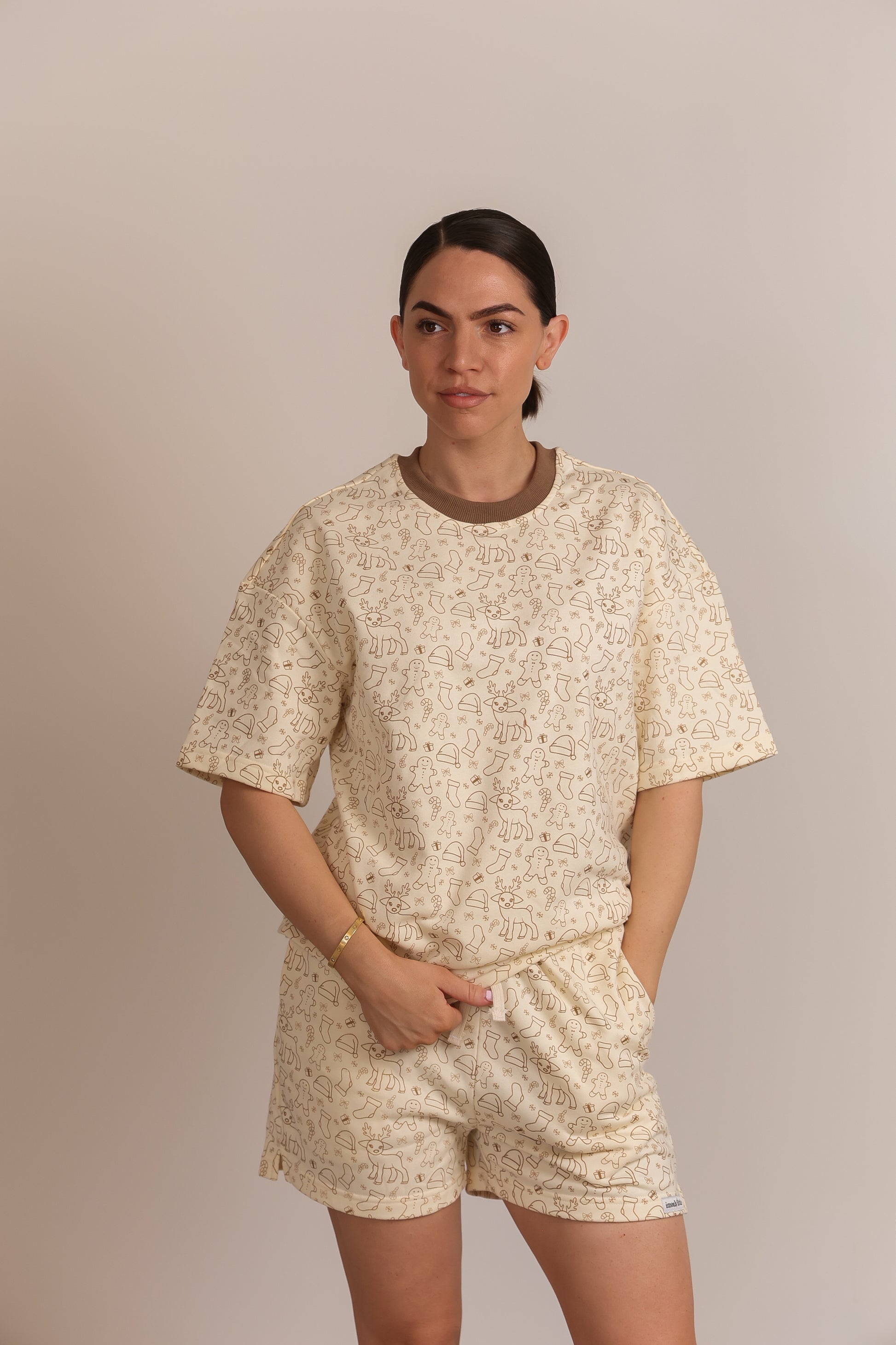 This cozy pre-order set features an oversized-style top and shorts with pockets, stretchy waste and draw string, perfect for festive photos or a special Christmas Day outfit. Made from soft Terri fabric for ultimate comfort, the cream ivory set is adorned with our custom Merry print and finished with a mocha trim, creating a neutral, earthy look ideal for the minimalist families.