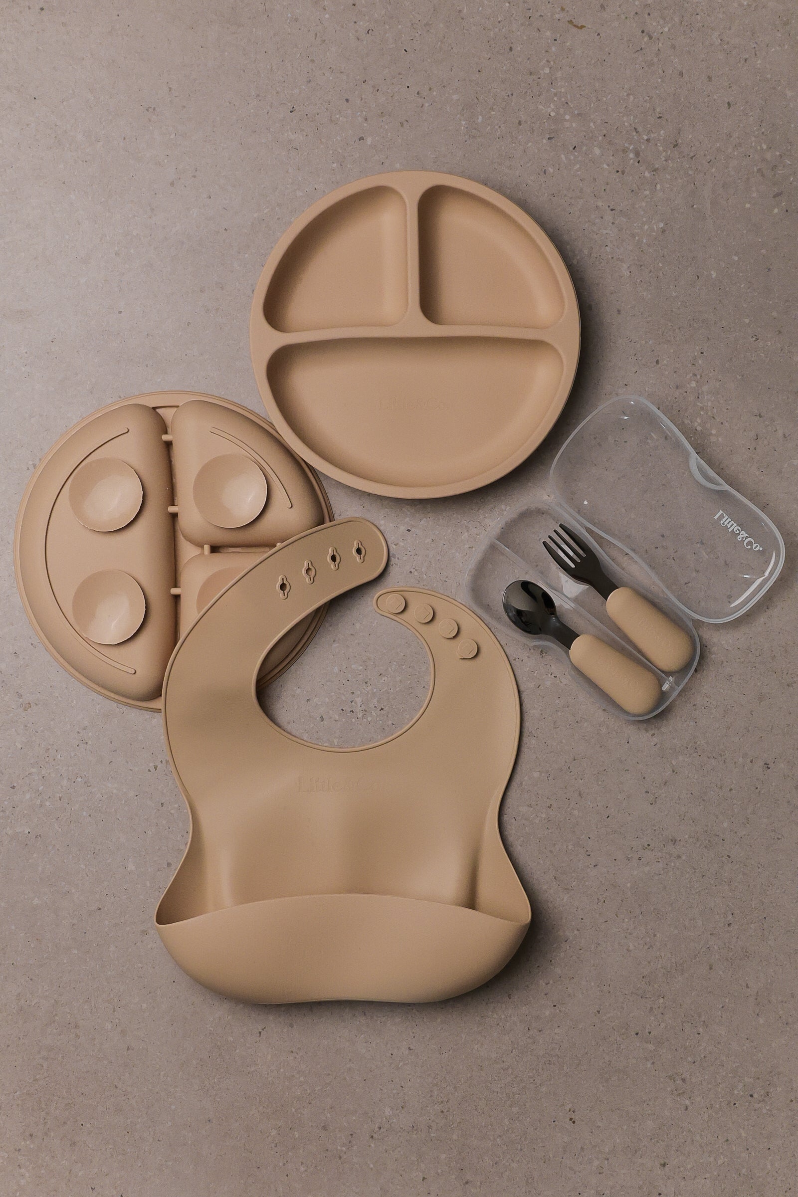 • Mini cutlery set with silicone grips designed to support self feeding and fine motor skills