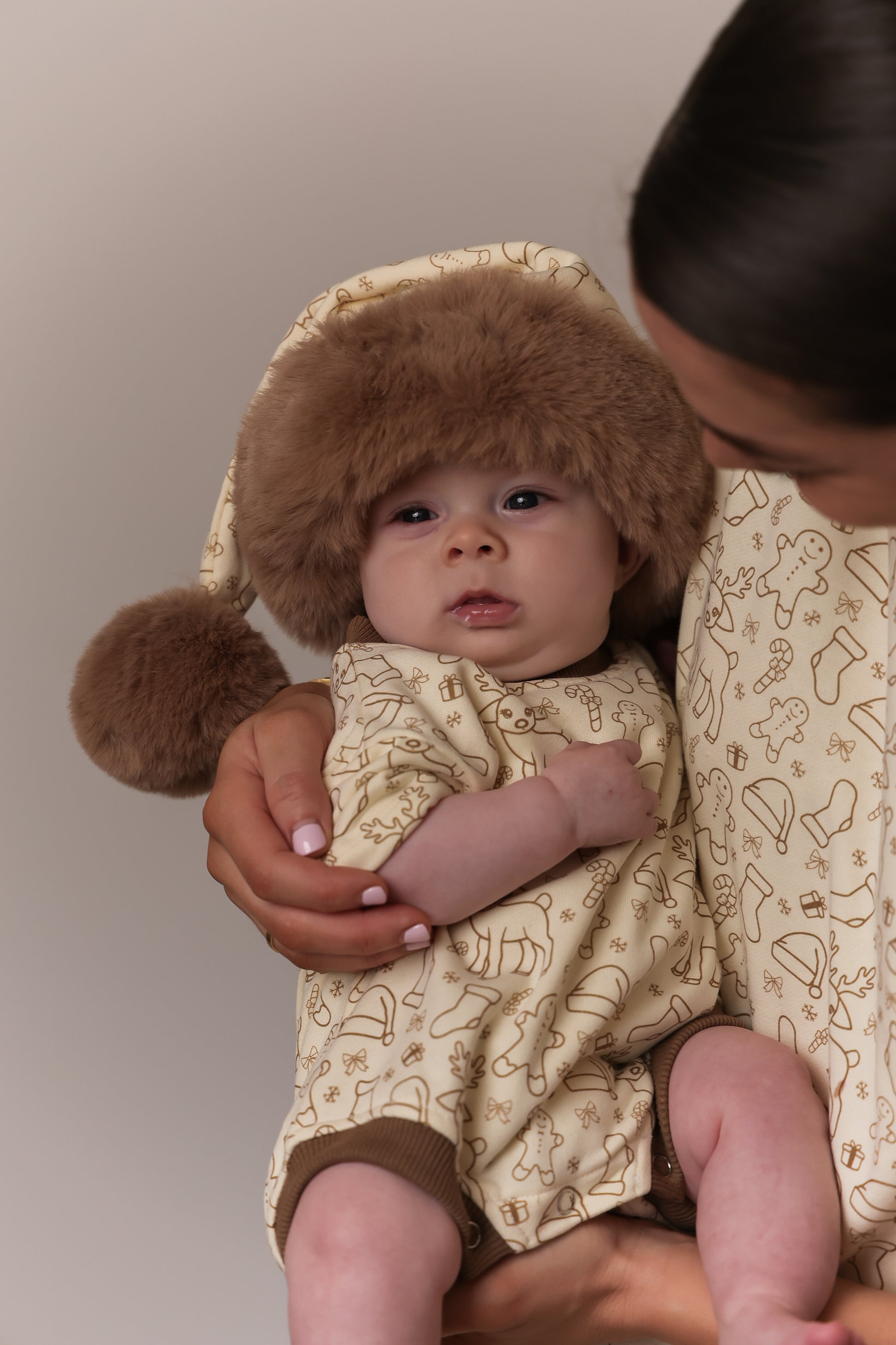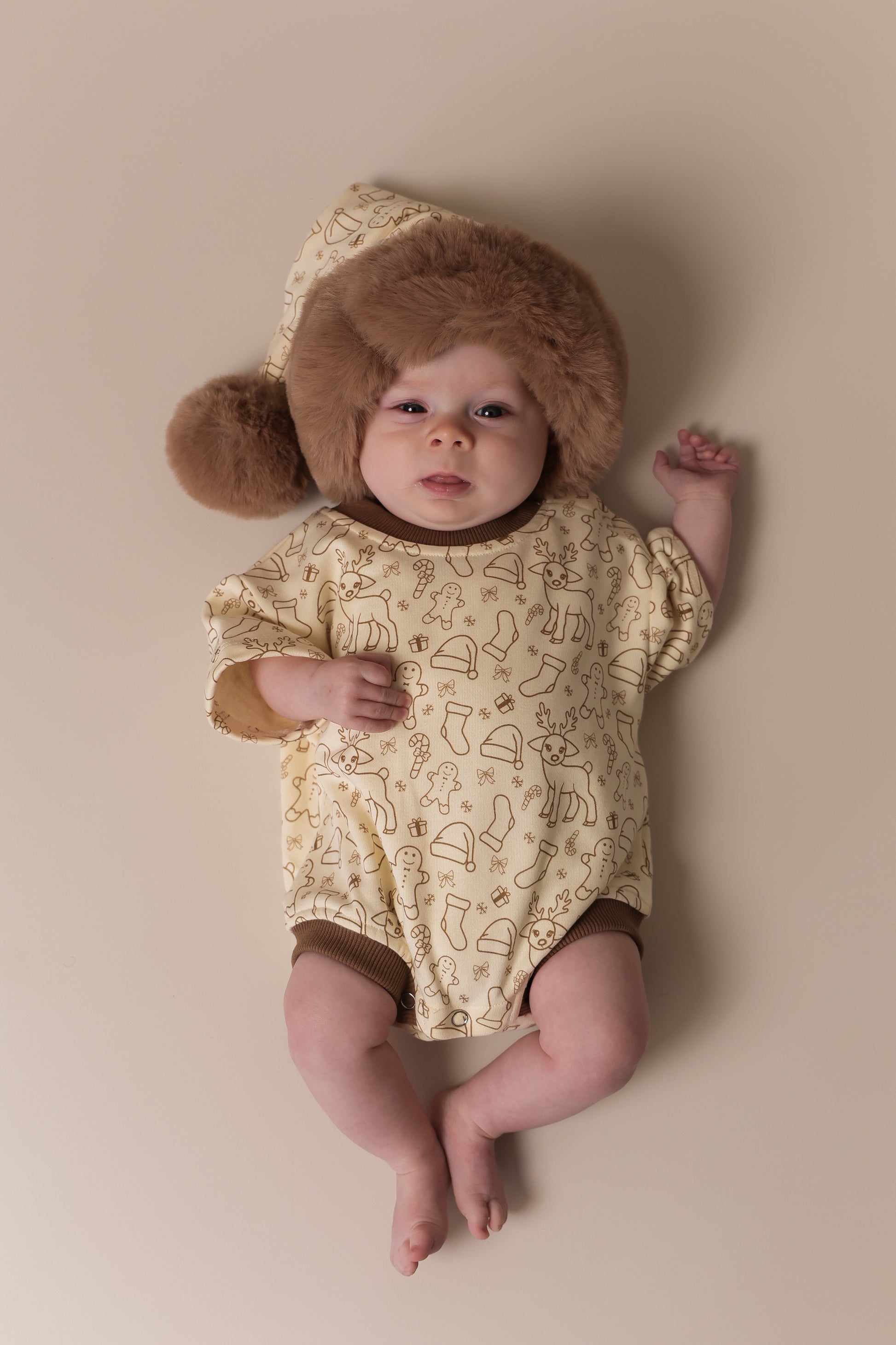Introducing our Oversized Custom Merry Print Christmas Romper—crafted for comfort and style in our exclusive, oversized design. Made from soft, cozy terry fabric, this unisex romper in a charming oat-coloured Merry print is perfect for festive photos or a cozy Christmas Day outfit. Designed with ease in mind, it features three bottom buttons for quick nappy/diaper changes and shoulder buttons to make dressing delicate little ones a breeze.